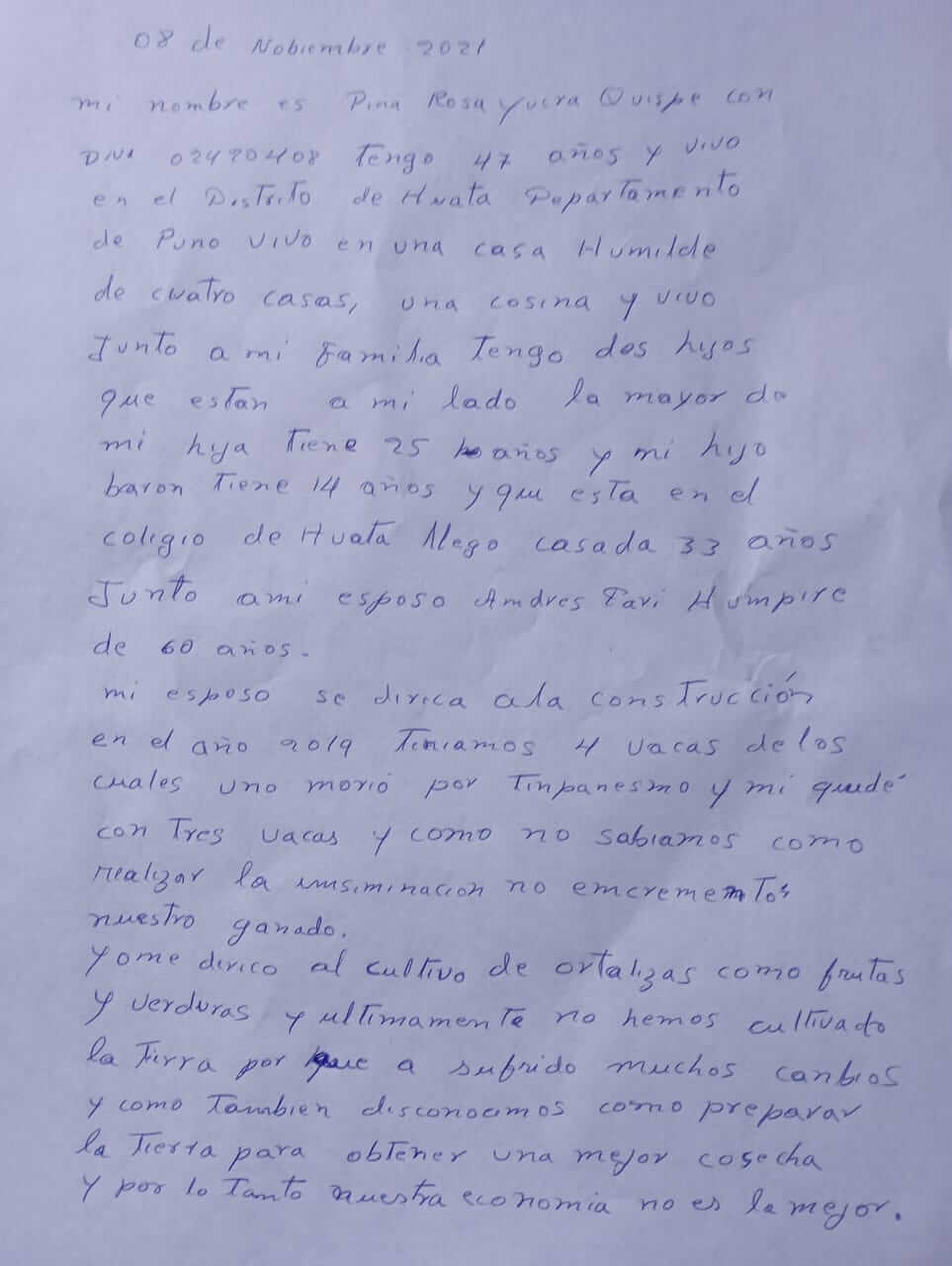 Mi nombre es Pina Rosa Yutra Quispe y tengo 47 años, vivo en el distrito de Huata, departamento de Puno. Vivo en una casa humilde de cuatro casas, una cocina y vivo junto a mi familia. Tengo dos hijos que están a mi lado; la mayor de mi hija tiene 25 años y mi hijo varón tiene 14 años y aquí está en colegio de Huata. Llevo casada 33 años junto a mi esposo Andrés Pari Hunpiri de 60 años.