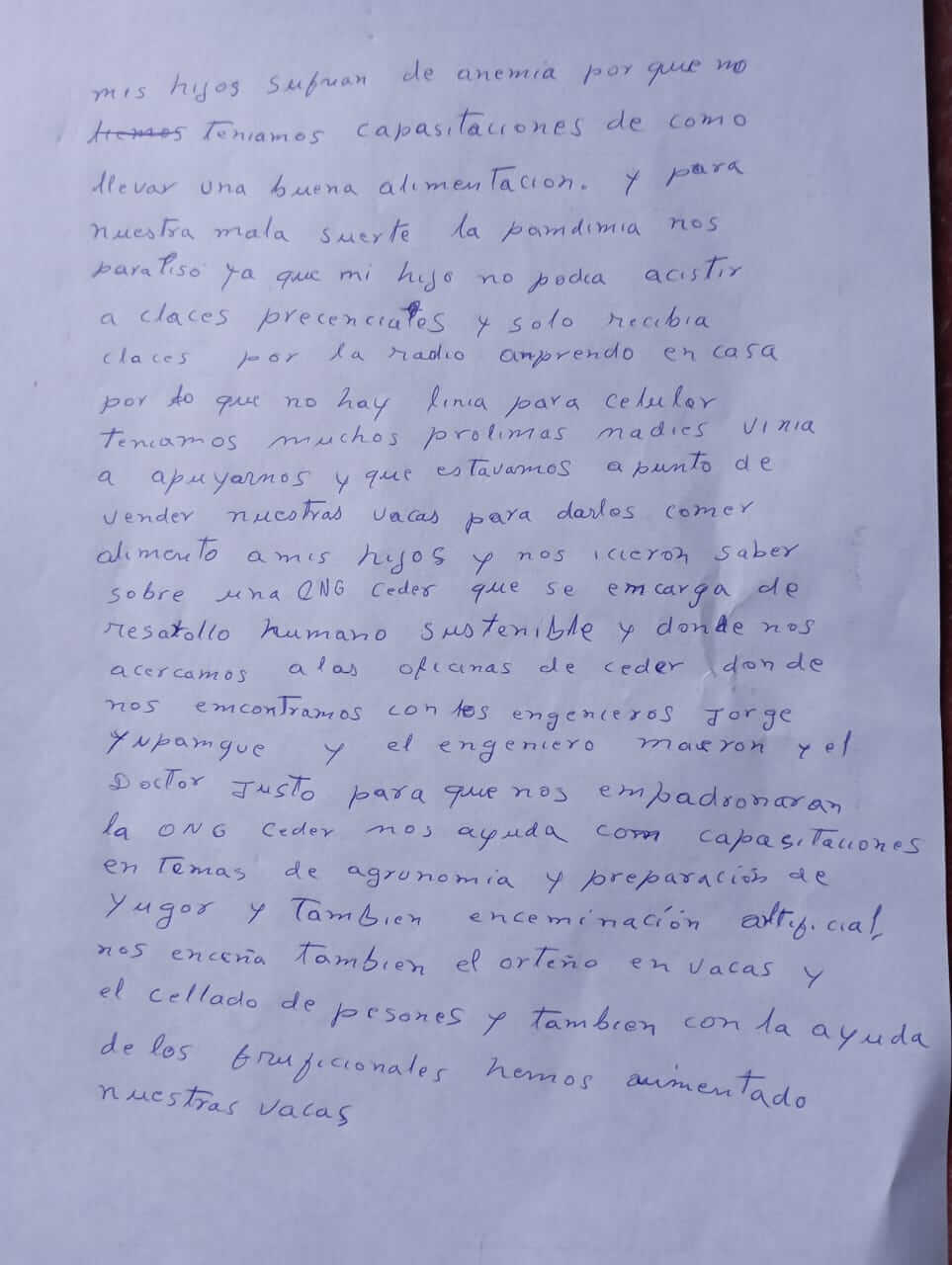 Mis hijos sufrían de anemia porque no teníamos capacitaciones de cómo llevar una buena alimentación. Para nuestra mala suerte, la pandemia nos paralizó, ya que mis hijos no podían asistir a clases presenciales y solo recibían clases por la radio Aprendo en Casa. No teníamos una línea para celular y teníamos muchos problemas. Nadie venía a apoyarnos y estábamos a punto de vender nuestras vacas para darles de comer a nuestros hijos.