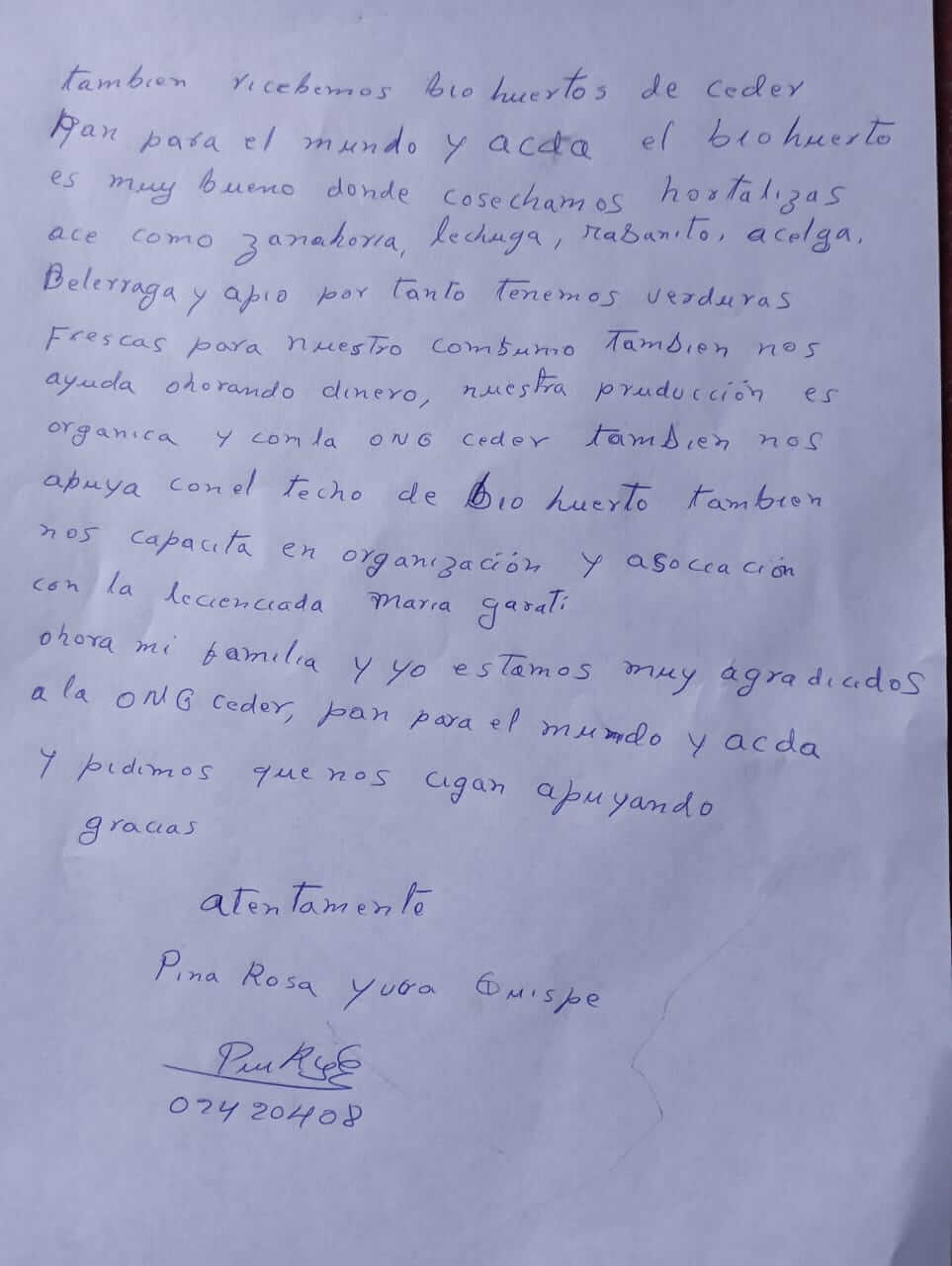 Ahora mi familia y yo estamos muy agradecidos con la ONG CEDER, Pan para el Mundo y ACDA. Pedimos que nos sigan apoyando. Gracias.